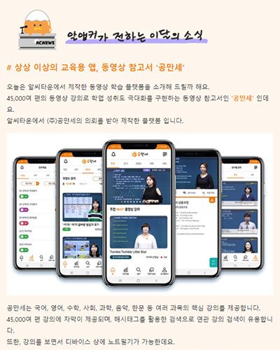 # 상상 이상의 교육용 앱, 동영상 참고서 '공만세' 오늘은 알씨타운에서 제작한 동영상 학습 플랫폼을 소개해 드릴까 해요. 45,000여 편의 동영상 강의로 학업 성취도 극대화를 구현하는 동영상 참고서인 '공만세' 인데요. 알씨타운에서 (주)공만세의 의뢰를 받아 제작한 플랫폼 입니다. 공만세는 국어, 영어, 수학, 사회, 과학, 음악, 한문 등 여러 과목의 핵심 강의를 제공합니다. 45,000여 편 강의에 자막이 제공되며, 해시태그를 활용한 검색으로 연관 강의 검색이 유용합니다. 또한, 강의를 보면서 디바이스 상에 노트필기가 가능한데요. 현재 WEB과 Android APP을 지원하고 있습니다.(iOS APP은 개발중에 있어요~) 많은 관심 부탁드려요~! ![]() ![]()